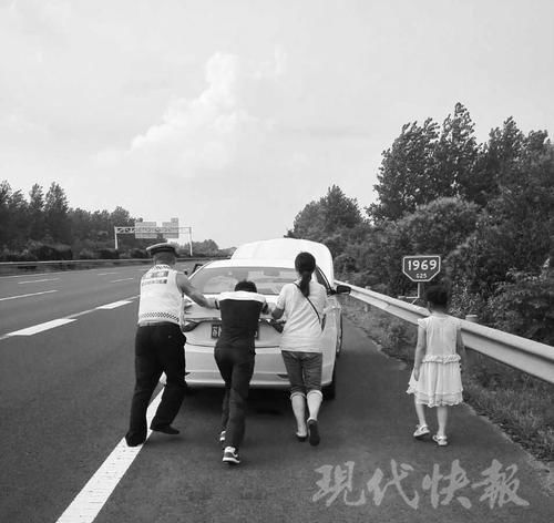 △图为史伟年同志在 G25 高速执勤时,帮助车主将抛锚车辆推至应急车道。他站在了靠近行车道的一侧,总是把危险留给自己,把安全带给他人。